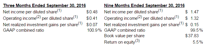 Catastrophe losses totaled $12.5 million ($0.32 per diluted share) for the third quarter, compared to $7.0 million ($0.18 per diluted share) for the same period in 2015. Year-to-date, catastrophe losses totaled $52.4 million ($1.32 per diluted share), compared to $27.3 million ($0.71 per diluted share) for the same period in 2015.