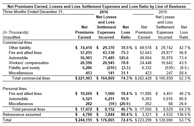 Net income for the property and casualty insurance segment, including net realized investment gains and losses, totaled $12.0 million ($0.46 per diluted share) for the fourth quarter, compared to net income of $30.9 million ($1.21 per diluted share) for the fourth quarter of 2015. For the full year, net income totaled $49.1 million ($1.90 per diluted share), compared to net income of $85.3 million ($3.38 per diluted share) for the full year 2015.