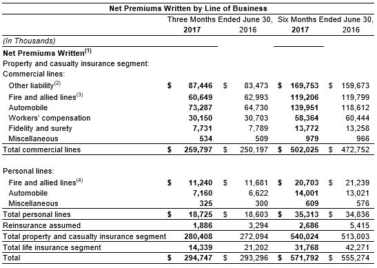 Net income for the property and casualty insurance segment, including net realized investment gains and losses, totaled $0.1 million ($0.01 per diluted share) for the second quarter, compared to net income of $3.4 million ($0.13 per diluted share) in the same period in 2016. Year-to-date, net income for the property and casualty insurance segment, including realized investment gains and losses, totaled $18.7 million ($0.73 per diluted share), compared to net income of $25.5 million ($1.00 per diluted share) in the same period of 2016.