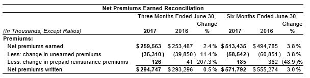 Net premiums earned increased 5.6 percent to $245.2 million in the second quarter, compared to $232.3 million in the same period of 2016. Year-to-date, net premiums earned increased 6.4 percent to $481.7 million, compared to $452.5 million in the same period of 2016. The increases in both the three- and six-month periods ended June 30, 2017 were due to continued organic growth from new business writings and geographical expansion.
