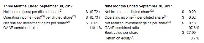 Catastrophe losses totaled $30.7 million ($0.80 per diluted share) for the third quarter, compared to $12.5 million ($0.32 per diluted share) for the same period in 2016. Year-to-date, catastrophe losses totaled $68.8 million ($1.74 per diluted share after tax), compared to $52.4 million ($1.32 per diluted share) for the same period in 2016.